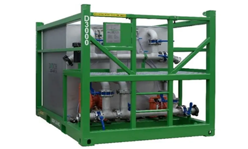 A slurry skid is a modular unit designed for mixing and dosing a filter aid, such as diatomaceous earth (D.E.), in industrial filtration systems. It is primarily used with a filter press to enhance the filtration process by preparing the filter media and maintaining the filter cake’s porosity.