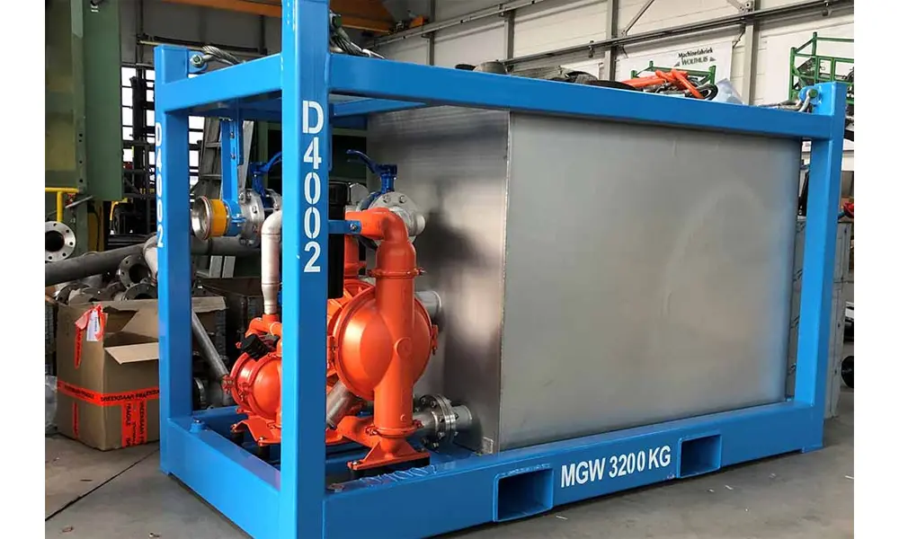 Filtration dual mixing slurry skid is a complete unit for pre-coating and body feed of the filter press. The unit is complete with 2 mixing tanks both 17 BBL/2.7 m³, air driven pre-coat and body feed pump. The frame is equipped with a working platform for safe and easy adding filter aid (DE media) into the mix tanks.